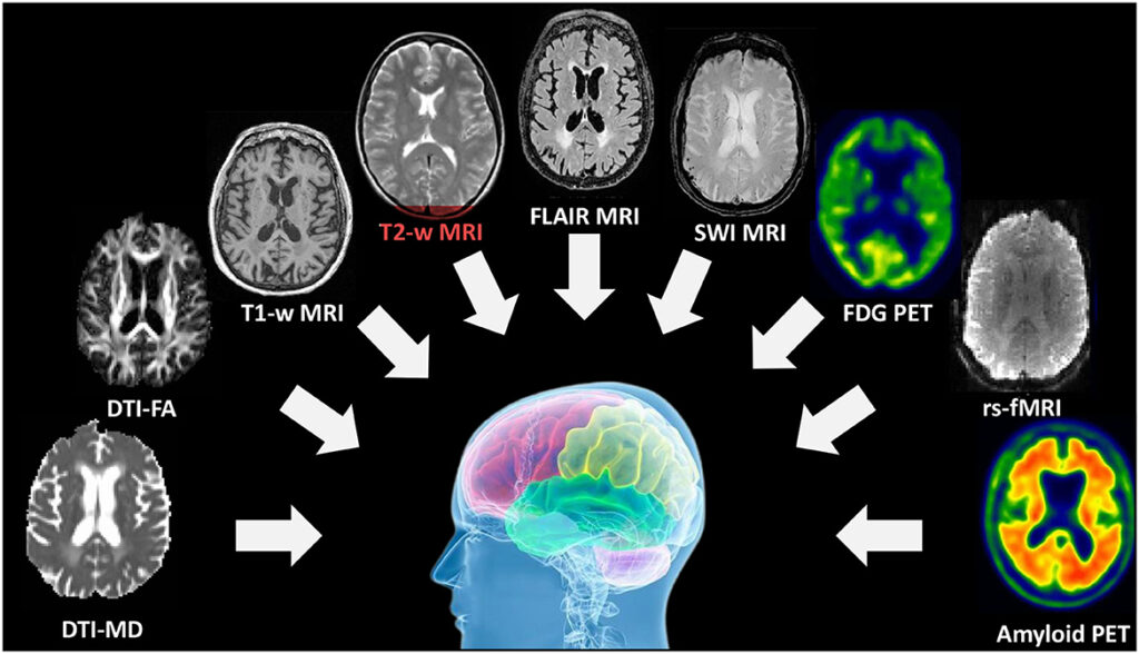 Common data sources include brain imaging scans, electrical neural signals, genetic data, and behavioral metrics.